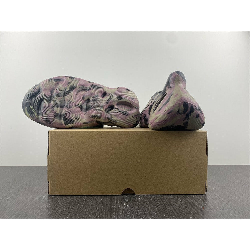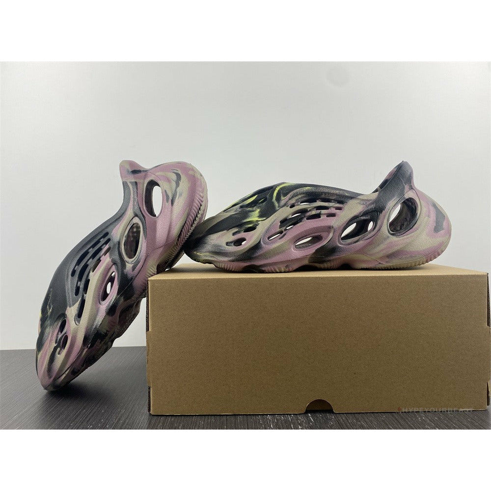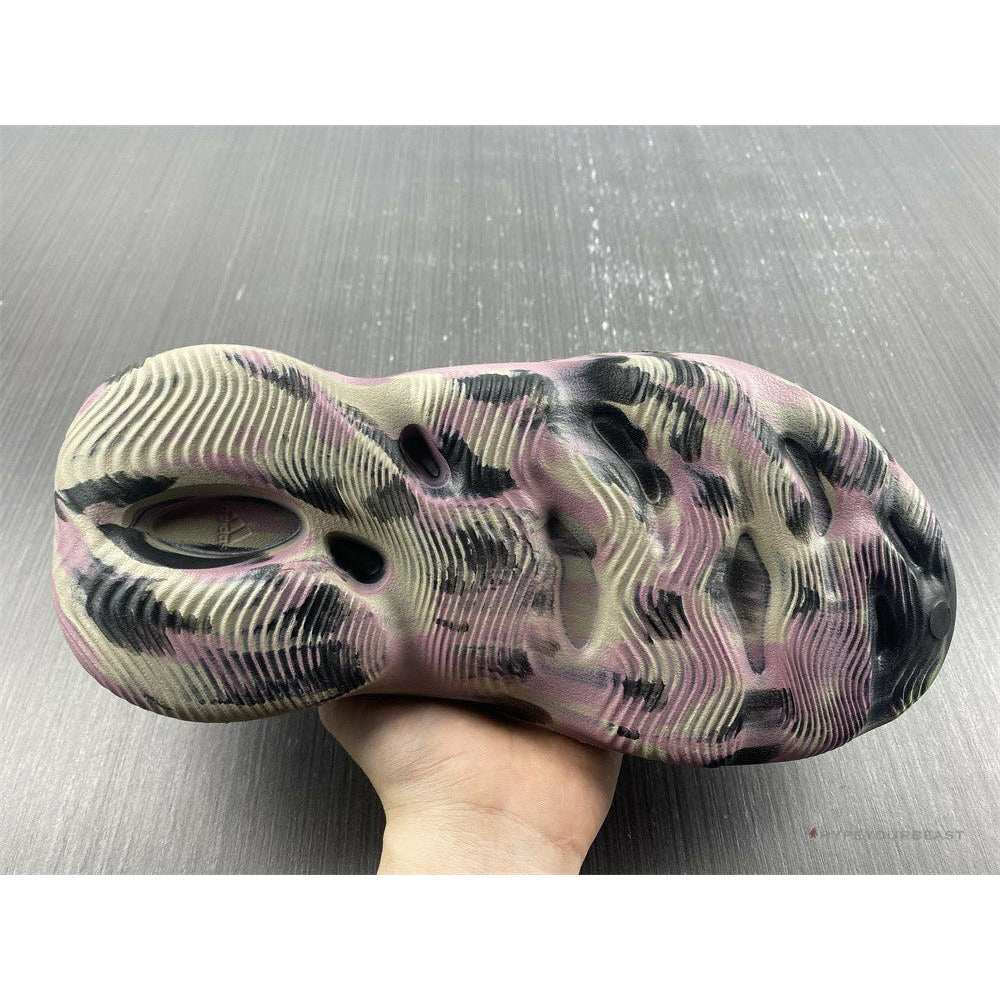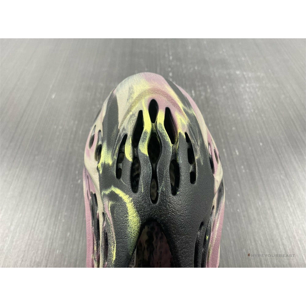 The adidas Yeezy Foam RNR MX Carbon showcases a captivatin...g blend of pink, yellow, purple, and dark grey marbled EVA foam, constructed with recycled algae. The design incorporates ventilation holes throughout, ensuring breathability. Supporting the foot is a sculptural sole that offers both cushioning and stability. ÂÂ