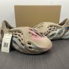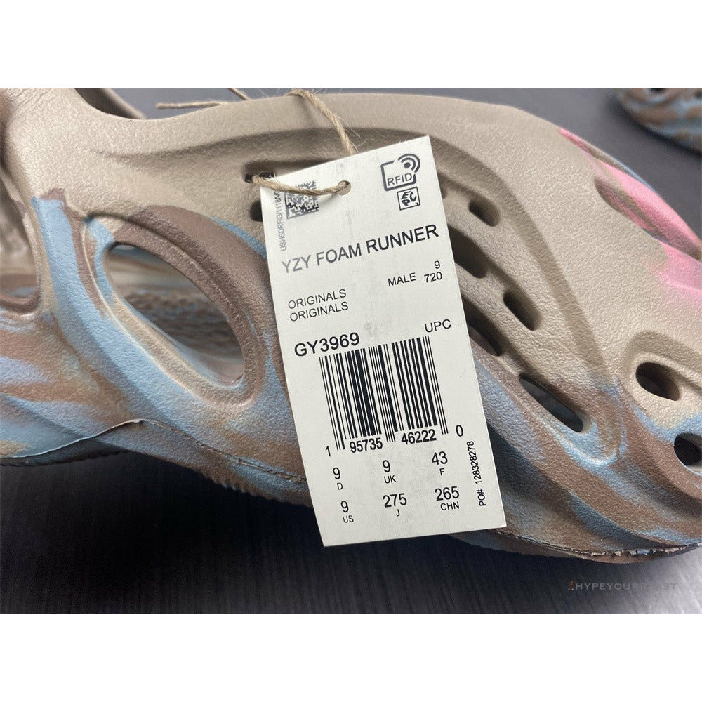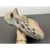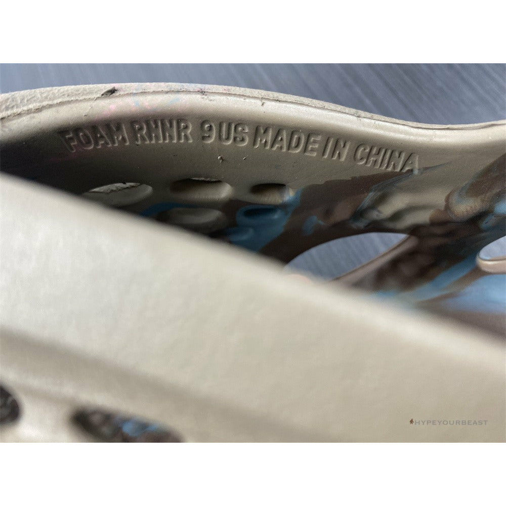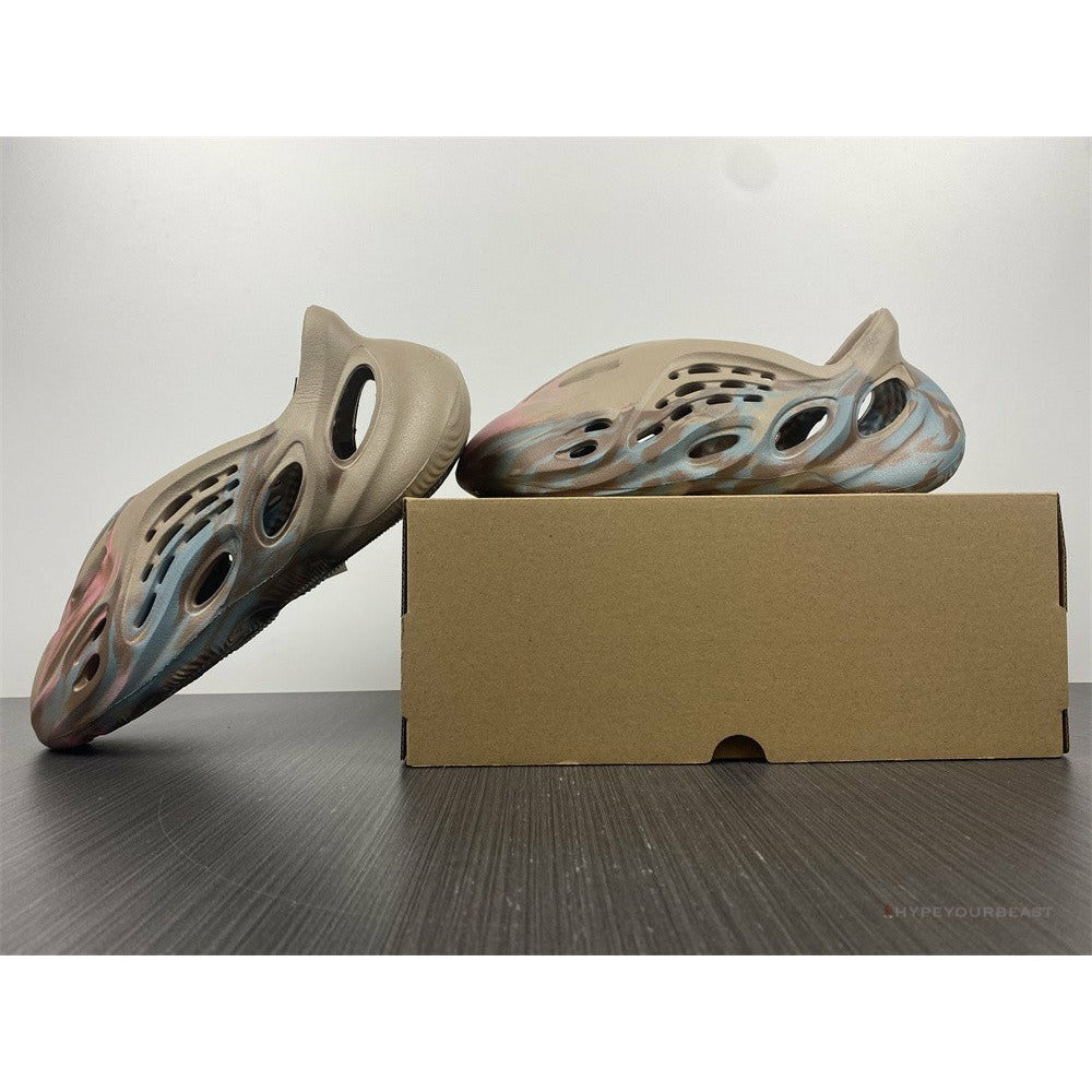 The Adidas Yeezy F...oam RNNR MX Sand Grey features injected EVA foam and part-harvested algae for a lightweight slip-on build. The silhouette showcases earth-toned colors in a swirling pattern. The Yeezy slides have ventilation ports on the sides and forefoot, with coral accents on the MX Sand Grey colorway. The underfoot has a wavy pattern for traction on various surfaces, while the ports provide breathability. The slip-ons also offer a soft top layer for added comfort.