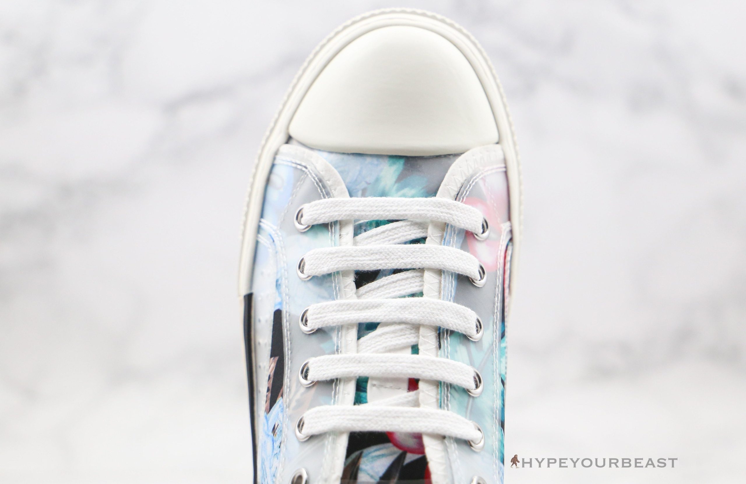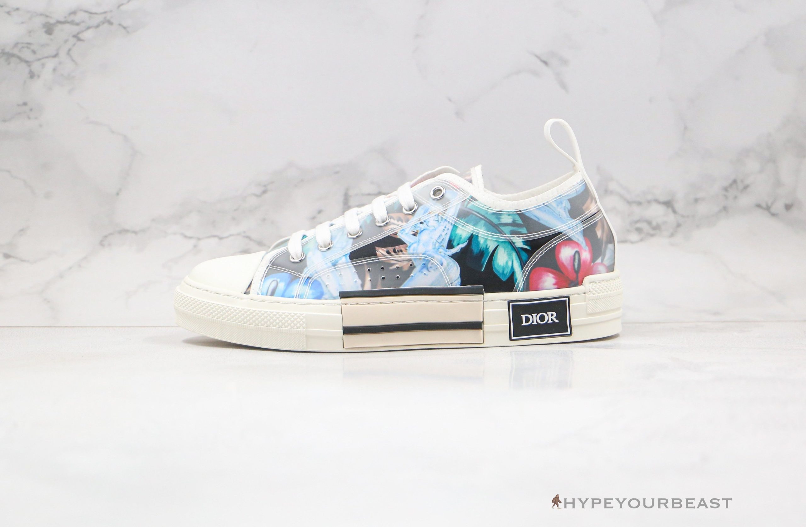 A multicolor pair of Dior B23 Low top multicolor sneakers embraces astonishing prints and style. This low-top footwear brings out summer feels with its colorful beach leaves prints with a black backdrop. These sneakers also carry the iconic white translucent... overlays which top the prints creating a new design. Dior B23 Low top multicolor sneakers are completed with a Dior branding on the thick white midsoles with a classic Dior color patch of blue and cream on the side. Own a pair of these classic low-top sneakers and experience its exceptional style on your feet.