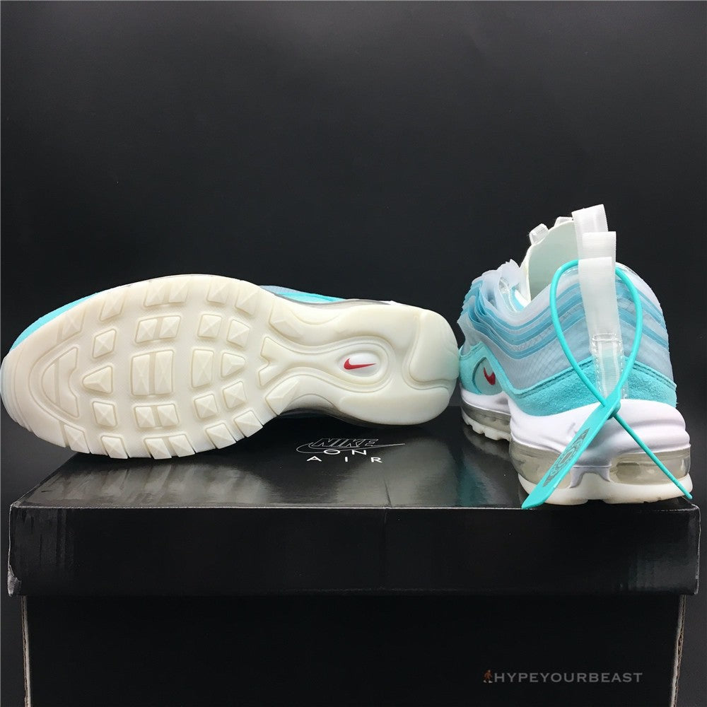 Nike Air Max 97 ‘Shanghai Kaleidoscope’ showcases ice blue, white, and red colorways. These sneakers belong to the “On Air” collection from where different cities designed their Nike Air Max shoes. They invited Seoul, Lo...ndon, Paris, Tokyo, New York, and Shanghai. As the competition ended, Cash Ru of Shanghai won through its Nike Air Max 97 ‘Shanghai Kaleidoscope’ design. The sneakers include cloud-like effects with outstanding multiple layers of translucent blue construction. It also showcases a wavy style on the upper. The icy light blue tone made the footwear very appealing. Furthermore, Nike Air Max 97 ‘Shanghai Kaleidoscope’ is completed with the red Swoosh on the midfoot and fascinating midsoles and outsoles.